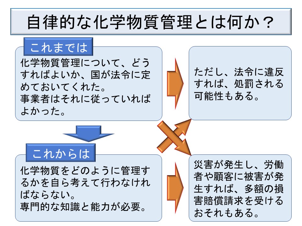 化学物質管理の分野では、現在、関係法令が改正され「法規制による管理」から「自律的な管理」への転換が求められている。自律的な管理においては、事業者は法令に従っていればよいということにはならない。自ら考えて行動することへの転換が求められるのである。