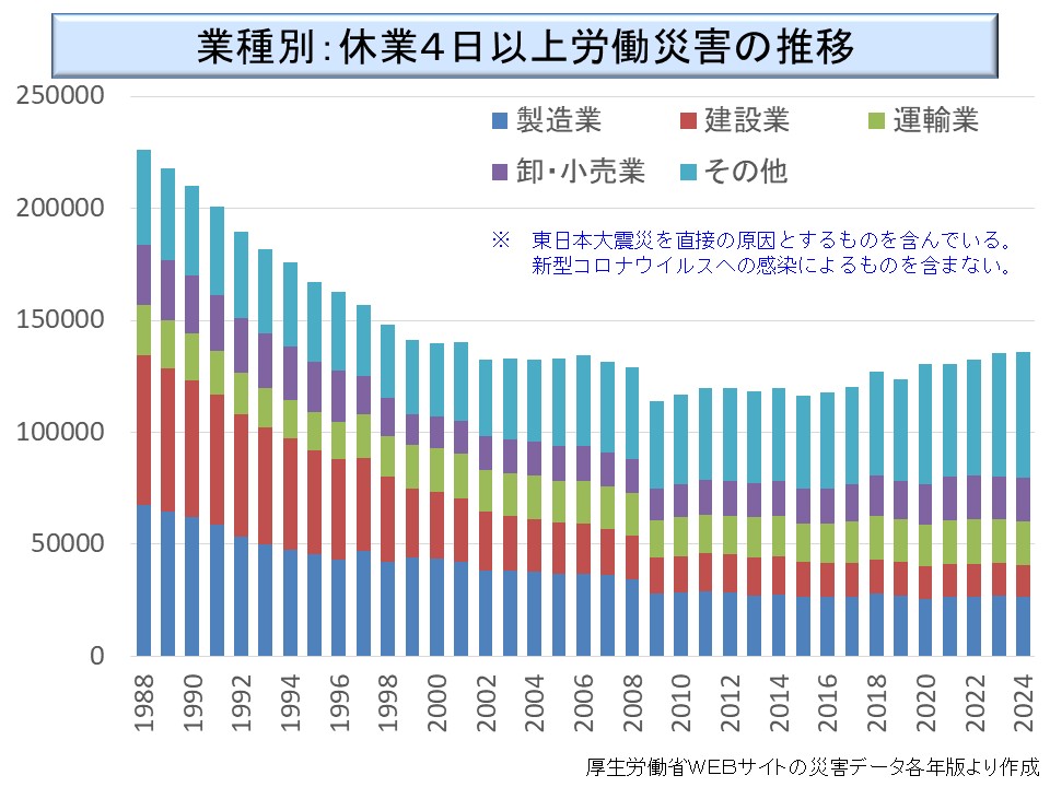 2024 年の労働力調査による「雇用者数」は、全体を1とすると製造業0.165、建設業0.064であるが、労働災害の発生割合は製造業0.197、建設業0.102である。すなわち労働災害は減少したものの、これら2つの業種が他の業種に比較して安全になったとまではいえない(※)。
