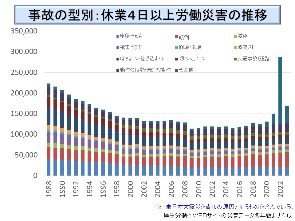 ※ 事故の型及び起因物については、陸災防のサイトが参考になる。なぜか、厚生労働省のサイトには事故の型分類表と起因物分類表がアップされていない。