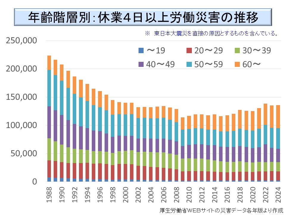 年齢階層別の労働災害の推移を次図に示す。これを見れば分かるように、2001 年まで全ての年齢階層で労働災害は減少していたが、その後の 2008 年頃までは減少傾向が見られず、その後は60歳以上の災害が増加している。これを見れば、最近の労働災害の大きな課題が高齢化であると分かるであろう。