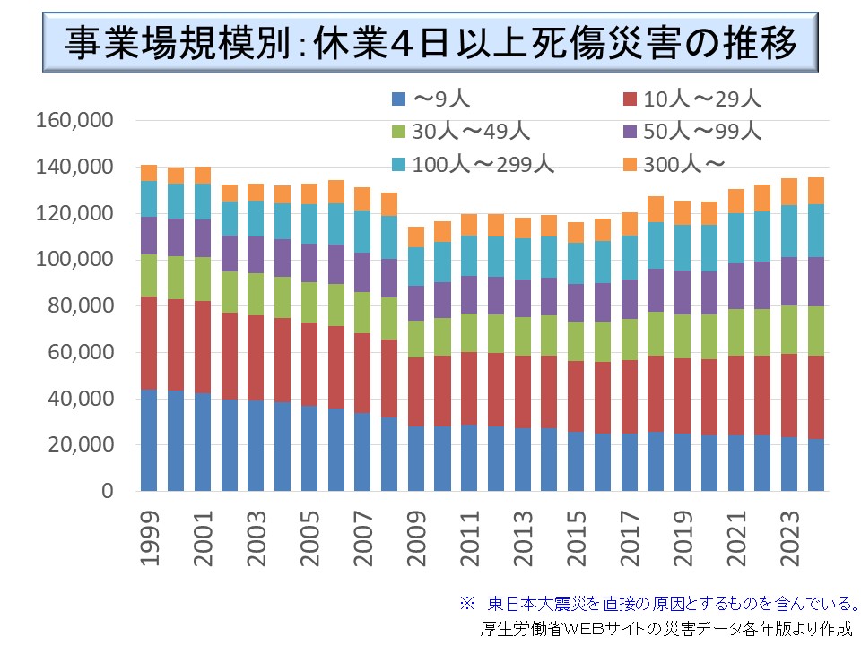 ここ10年程の状況を見ると、意外なことに9人以下の事業場の災害が減少しており、50~299人規模の事業場で災害が増加していることが分かる。