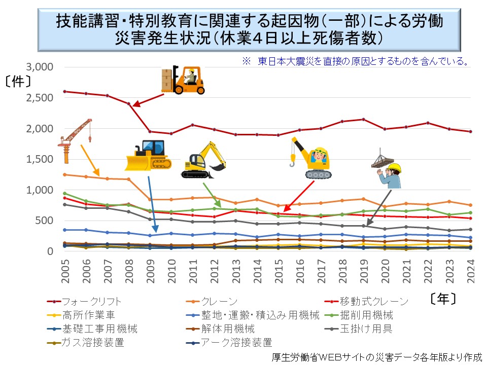 参考までに、フォークリフト、建設機械等による労働災害発生状況を示しておく。2004年より前は小分類によるデータがないので2005年以降のみである。少ないと言っても、かなりの件数が発生していることも事実である。
