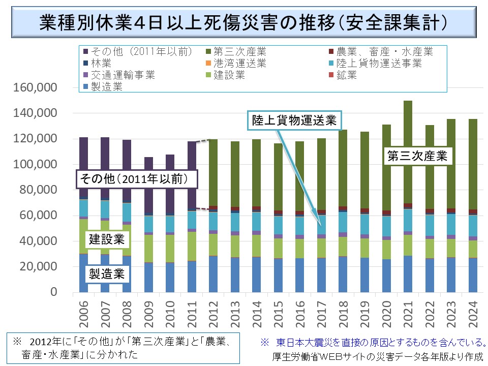 また、「第三次産業」は、厚生労働省の従来の災害統計業種区分の、「商業」「金融・広告」「保健衛生業」「接客・娯楽」「清掃・と畜」「警備業」の他に「その他」を合計している。この「その他」は、厚生労働省の公式統計の「その他」とは異なっている。