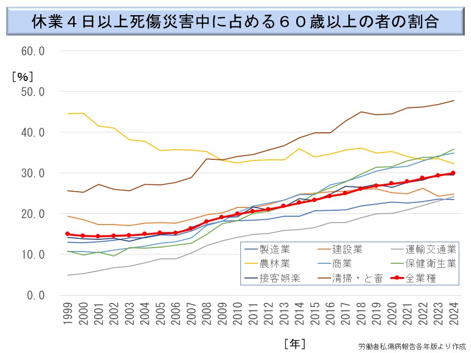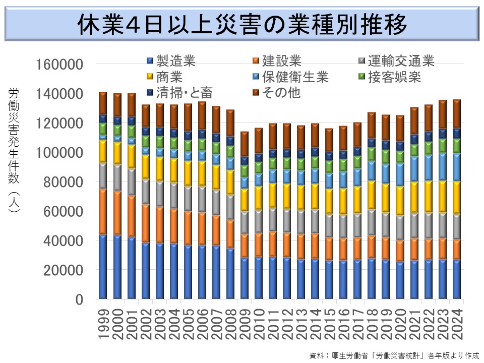 この2業種以外では 2000 年(平成 12 年)以降はむしろ増加に転じているが、これは高齢化に伴い転倒などの災害が増えていることによる。これについては後述する。