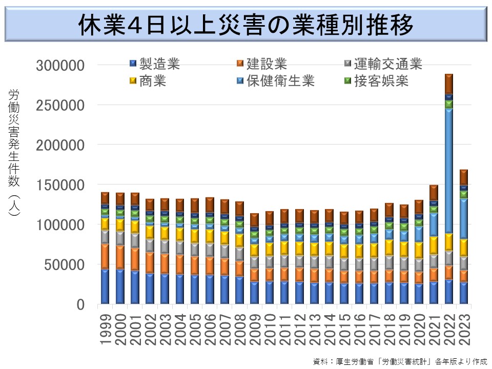 参考までに、新型コロナウイルスへの罹患による労働災害を含むものを示す。なお、2020年以降の「その他」の増加は、主に保健衛生業の「その他」の増加によるもので、新型コロナによる罹患がほとんどである。