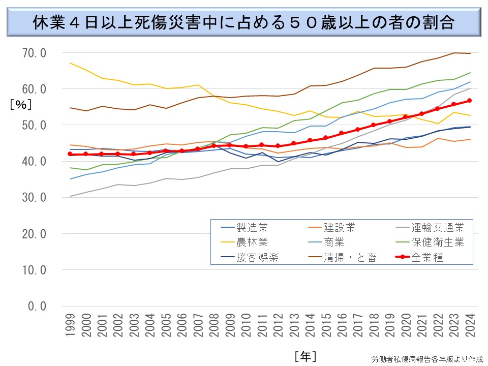 1999年(平成11年)に50歳以上のものの割合は 41.9 %であったが、その後上昇を続け、2019年(令和元年)には50.0%を超えた。また、60歳以上のものの割合をみると、1999年から2004年まで14%台で推移していたが、2005年に15%を超え、その後は大きく増加して2018年には26%を超えている。