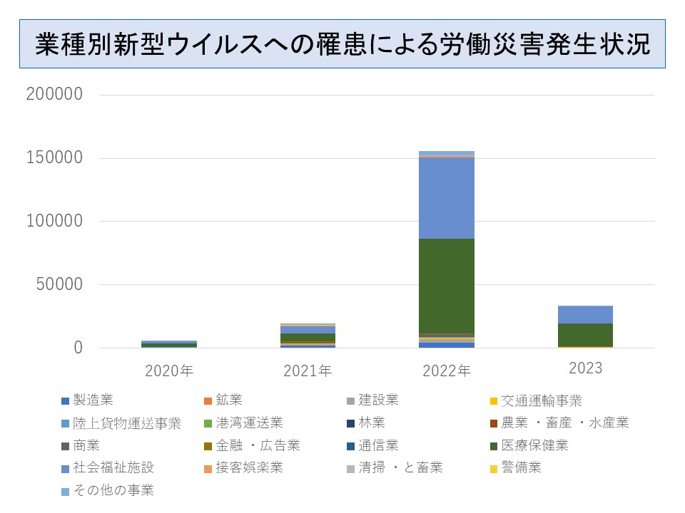 なお、新型コロナウイルスへの罹患による労働災害発生件数を業種別に表すと図のようになる(2024 年は公表されていない)。ほとんどが医療保健業と社会福祉施設であるが、他の業種においても広く発生していた。