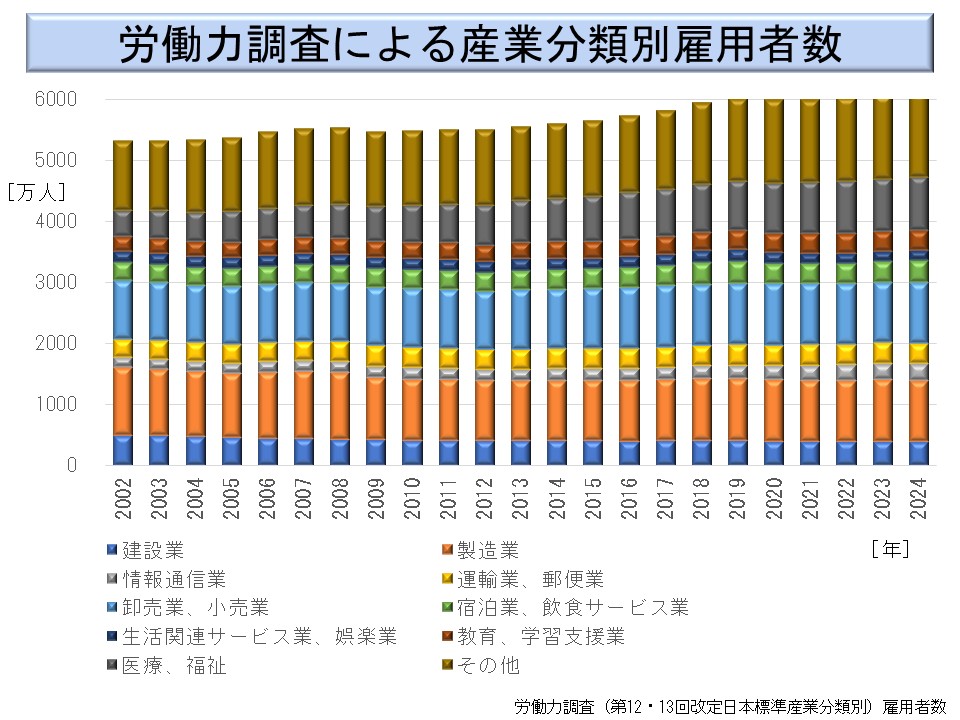 一方、右図は労働力調査(年平均)による、業種ごとの雇用者数の推移を示したものである。こちらも期間によって業種分類が変更されるが、本図は第 12・13 回改定日本標準産業分類が用いられている 2002 年(平成 14 年)以降について示してある。