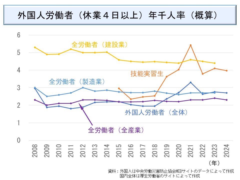 ※ 算定の方法が外国人労働者と国内全体で異なっているので、これをもってただちに外国人労働者と国内労働者の年千人率の比較するべきではない。また、外国人労働者の場合、労災隠し件数が大きいという指摘もある。
