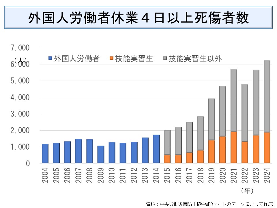 ※ 厚労省の公表データをグラフ化したものである。厚生労働省によると死傷病報告を基にしているとされているので、外交官と日韓法的地位協定による協定永住者は含まれていないと考えられる。