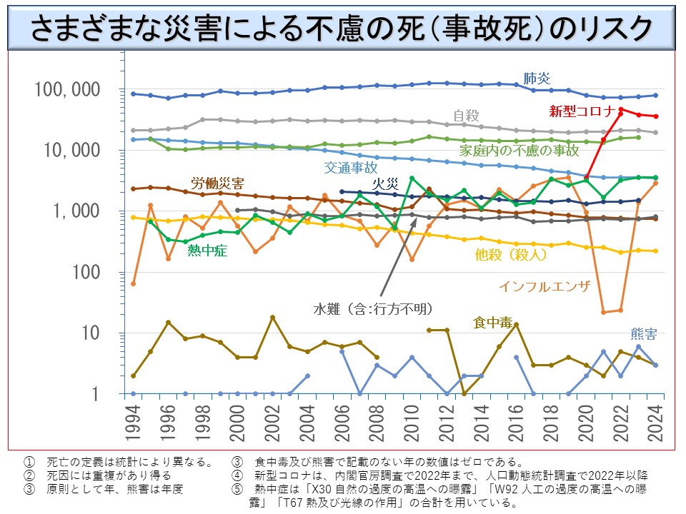 ※ 肺炎、インフルエンザ、自殺、他殺、交通事故、熱中症及び家庭内における不慮の事故は「人口動態統計」の年次確定数より。火災は「総務省報道発表資料」より。労働災害は「厚生労働省発表資料」より。水難は「警察庁生活安全局生活安全企画課公表資料より。食中毒は、厚生労働省医薬・生活衛生局食品監視安全課の「食中毒発生状況の概要について」より。熊害は、2008年以降は環境省の「クマ類による人身被害について [速報値]」、2007年以前は「クマ類の出没対応マニュアル(改訂版)」より。