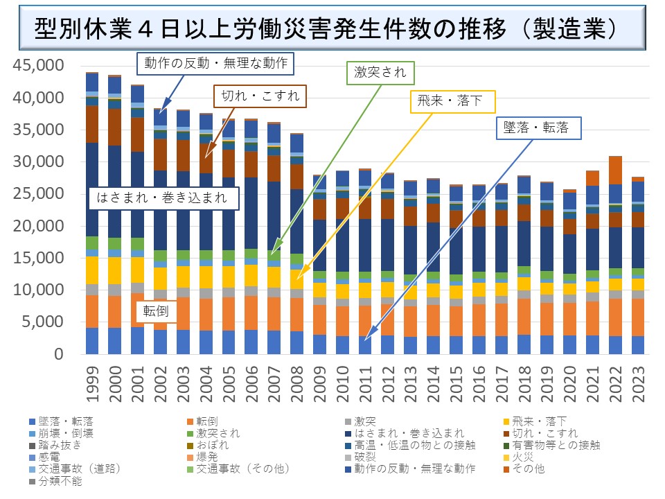 製造業の起因物別の災害発生件数の推移は次のようになっている。意外に思われるかもしれないが、工作機械については、厚労省の起因物別の統計が木材加工用機械、金属加工用機械及び一般動力機械と細分化していることもあるが、近年では安全装置が整備されているためそれほど多くはない。