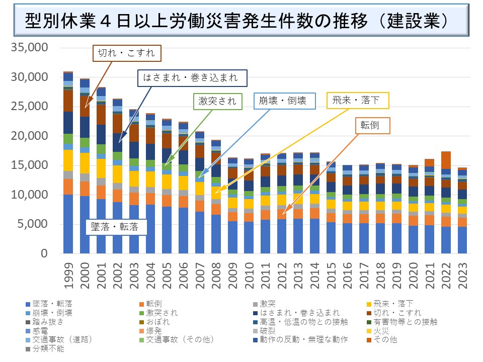 2024年の全業種の「仮設物、建築物、構築物等」を起因物とする災害では、転倒が 22,439 件(22,780 件)、墜落・転落が 7,981 件(7,935 件)、「動作の反動・無理な動作」が 3,172 件(3,041 件)、激突が 2,495 件(2,369 件)などとなっている。