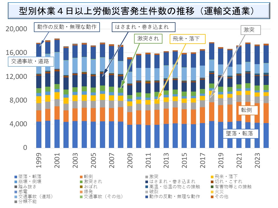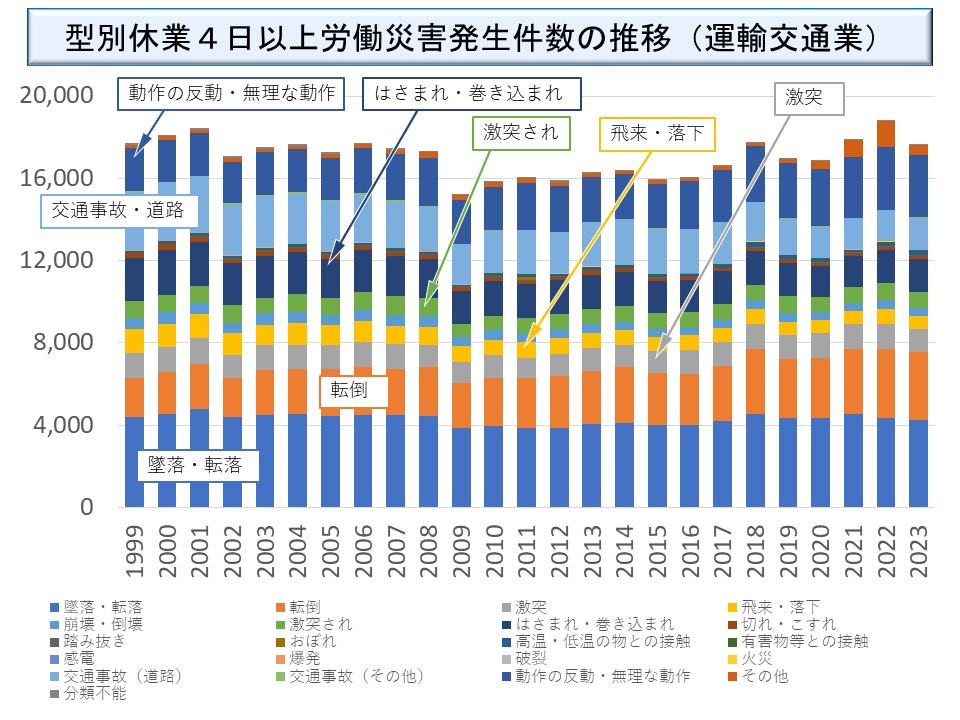 運輸交通業における事故型別労働災害発生状況についても、参考までに、新型コロナウイルスへの罹患による労働災害を含むものを示しておこう。