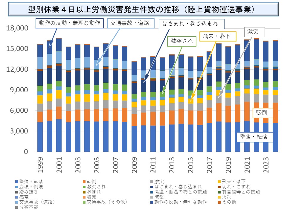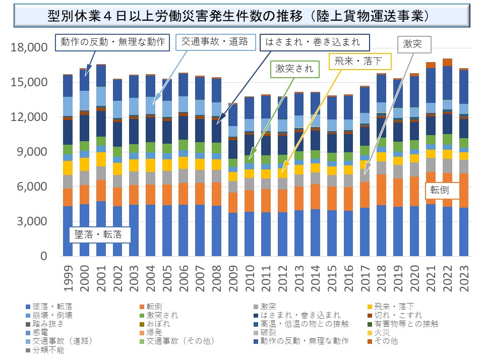 ここでも意外に思われるかもしれないが、陸上貨物運送業で最も多い型別災害は一番下の空色の部分で、「墜落・転落」なのである。また、下から2番目のオレンジ色の「転倒」も目立っている。他に目立つものとしては、上の方のブルーは「動作の反動・無理な動作」でその下の紫がかった青が「交通事故(道路)」である。その少し下にある濃い青が「はさまれ・巻き込まれ」で、そのすぐ下の緑が「激突され」である。