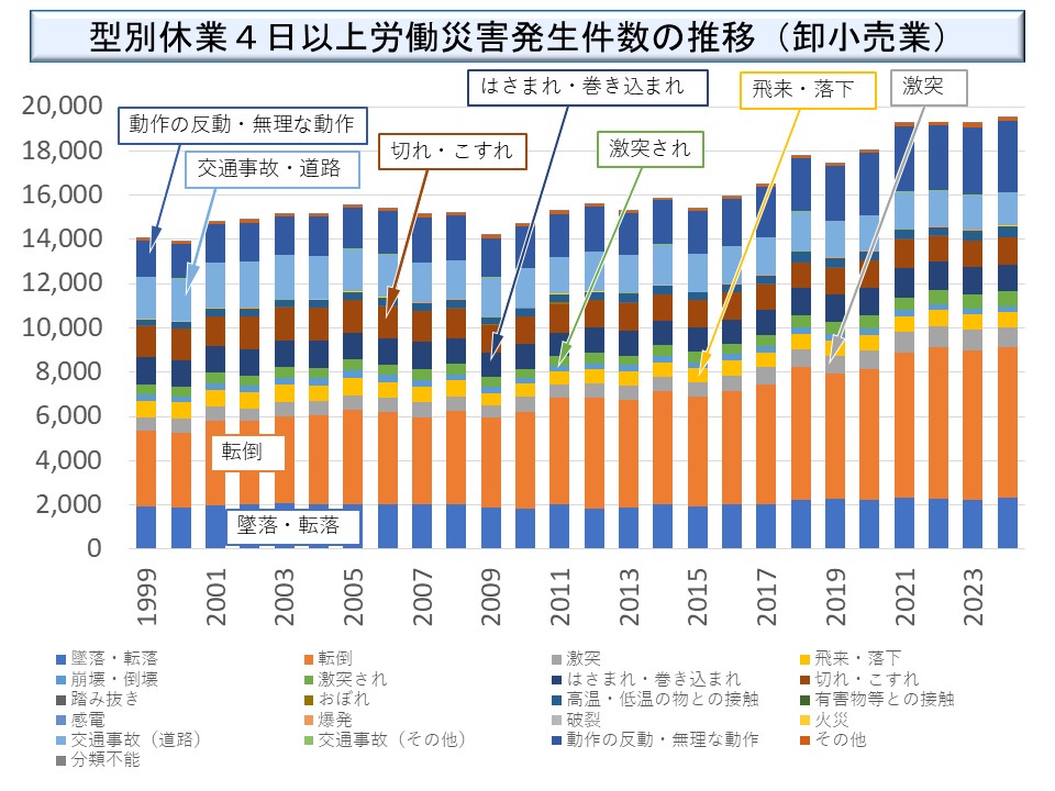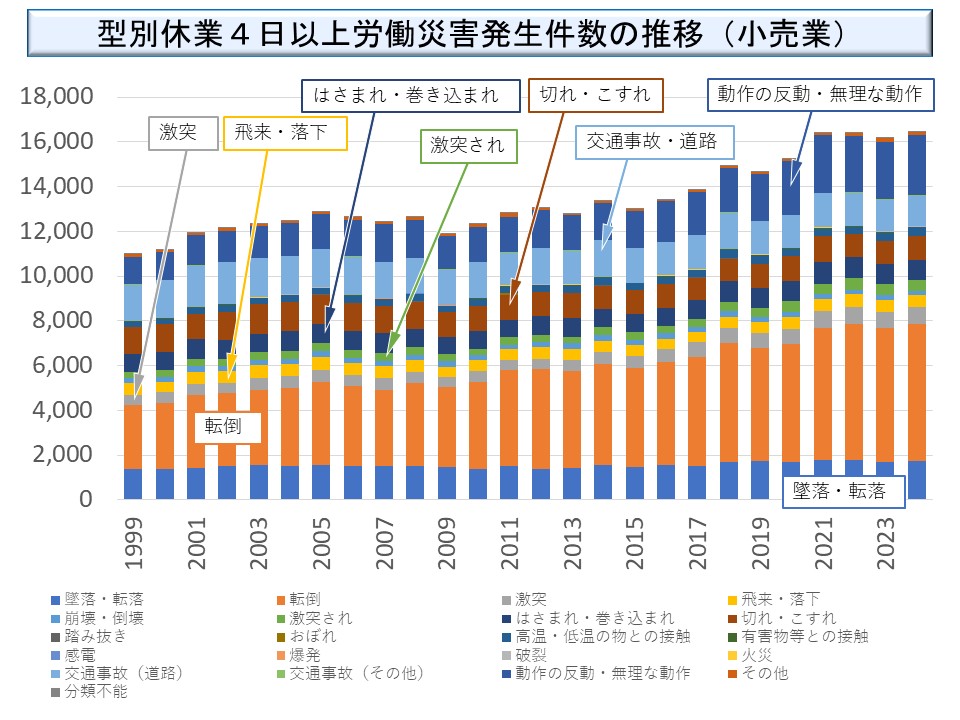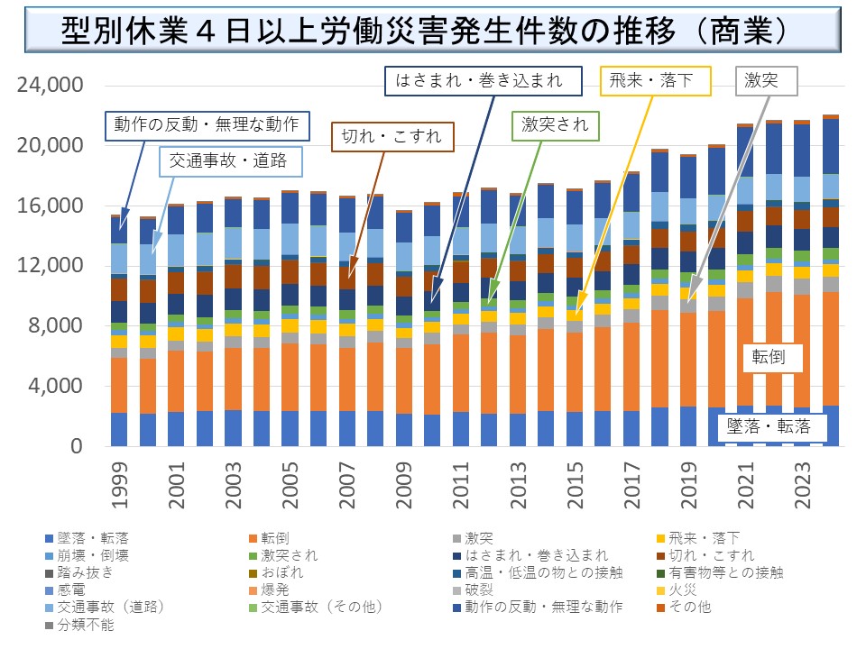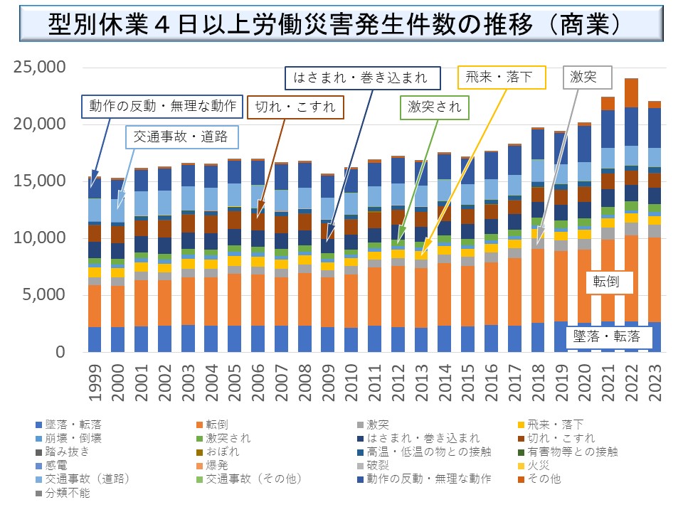 商業においては、高齢者に多い「墜落・転落」「転倒」「動作の反動・無理な動作」が目立っている。また、交通事故が一定の割合を占めるのも商業の特徴である。