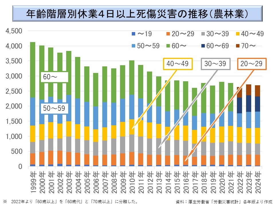 農林業は、就業者中に高齢者が占める割合が高いこともあり、高年齢者の労働災害発生件数の多い業種である。ただ、60 歳以上の高齢者の被災件数は、長期的に減少傾向にある。