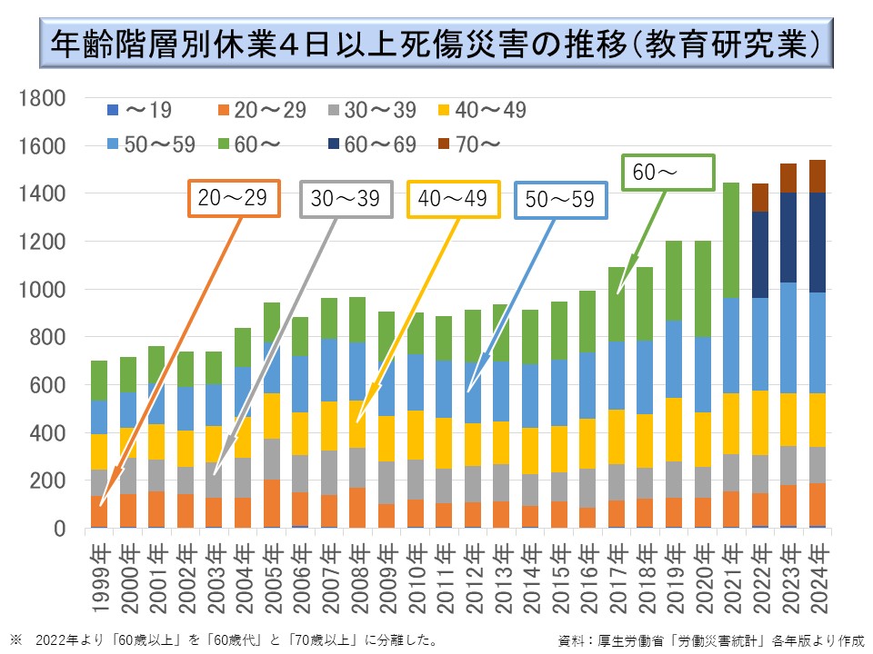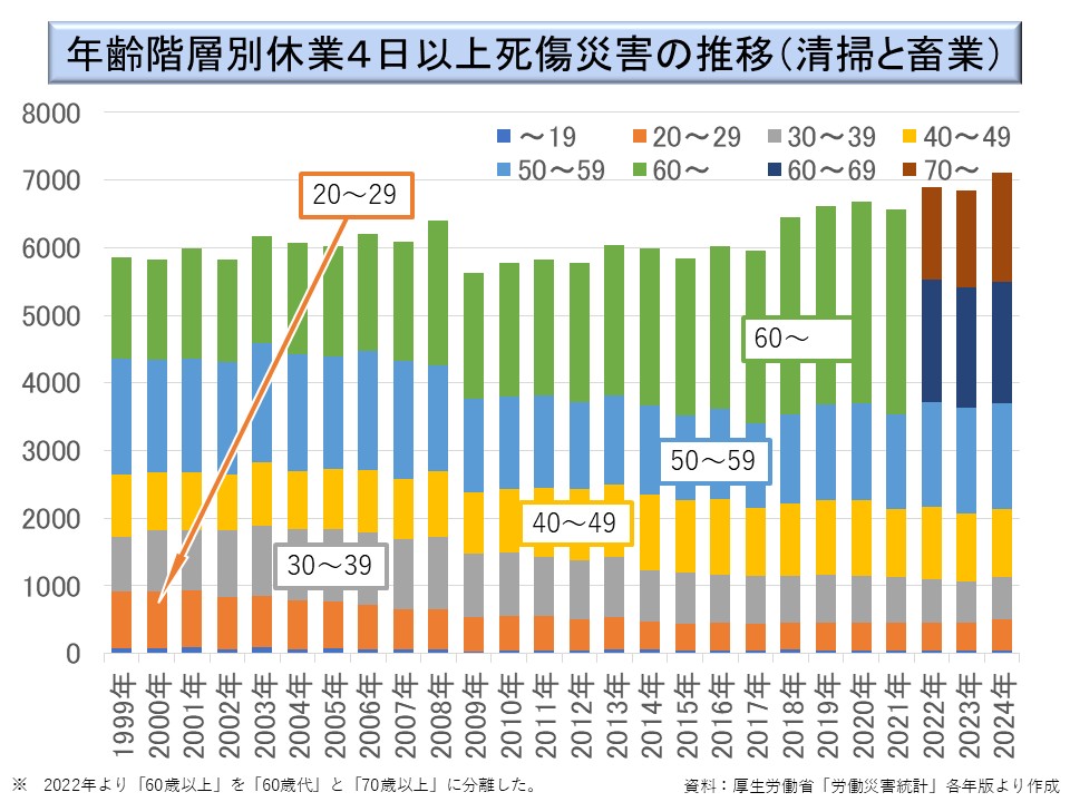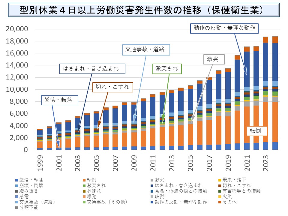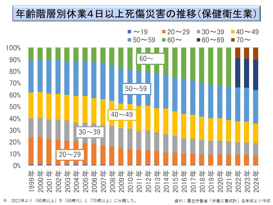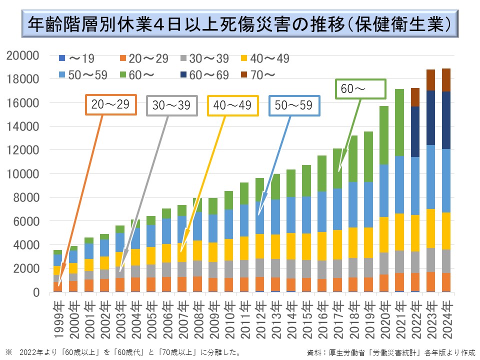 また、1999 年以降については、とりわけ 60 歳以上の労働災害発生件数の増加が著しいものがある。就業人口中に高齢者が増加する中で、保健衛生業に多い転倒や動作の反動、無理な動作が、高齢者に増加しているのではないかと思われる。