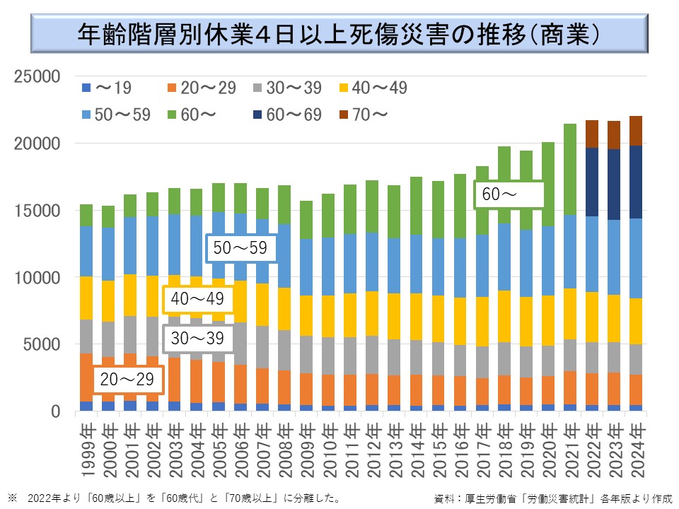 「卸小売業」で最も目立つのが下から2番目のオレンジ色の「転倒」である。この20年程、卸小売業の労働災害発生件数は増加傾向があるが、その最大の原因は転倒である。その背景にあるのが高齢化であることは言うまでもない。
