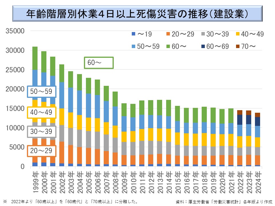 2008 年まで、ほぼすべての年齢層で災害発生件数は減少していたが、それ以降は 60 歳以上の減少傾向がみられなくなっている。減少傾向がみられないのは、60 歳以降にも働くケースが増えてきたことと、建設業の人材不足のために高齢者を危険な業務から外す余裕がなくなっていることも理由であろうか。