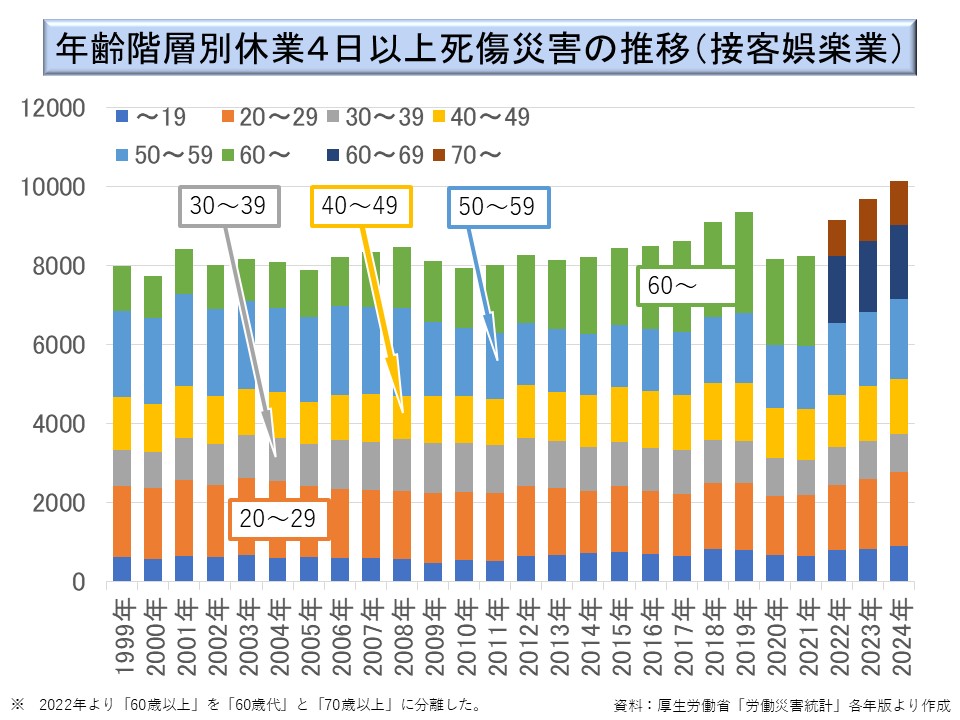 接客娯楽業の年齢構成別の災害発生件数の推移は次図のようになっている。