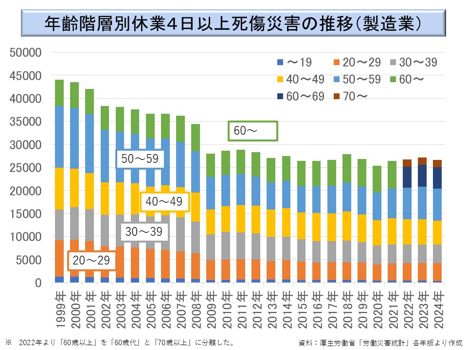 常識的には、この間、60 歳以上の就業者数は増加しているものと思われるが、製造業では 60 歳でいったん退職して災害リスクの高い第一線から退くことが多いために、60 歳以降の災害がそれほど増加しないのであろう。