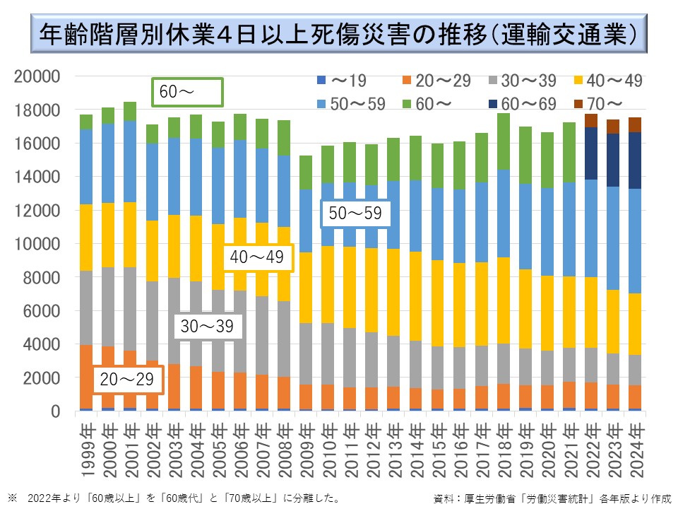 運輸交通業は、業種全体の労働災害発生件数の減少が、製造業や建設業ほどにはみられない。とりわけ 50~59 歳、60 歳以上の年齢構成の労働災害発生件数が増加傾向にある。