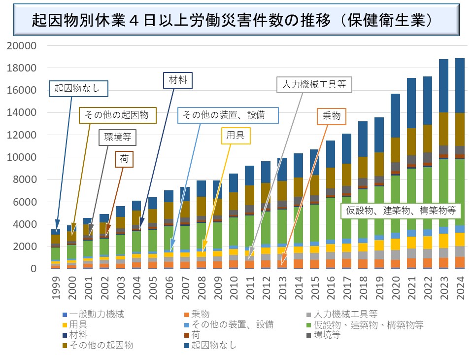 保健衛生業で特徴的なことは、その他の起因物、起因物なしの割合が高いことである。このグラフでは発生件数が低いものをその他の起因物にまとめているが、保健衛生業では、厚労省が発表したデータで「その他の起因物」がかなり多い。ここには病原菌等が含まれている(※)。
