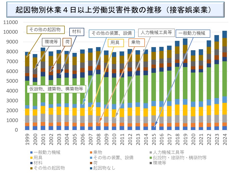 接客娯楽業についても、「仮設物、建築物、構築物等」の割合が高い。2024年の「仮設物、建築物、構築物等」を起因物とする災害 3,588 件(3,462 件)のうち通路が 1,785 件(1,749 件)、「階段、桟橋」が 623 件(588 件)となっている。ここでもほとんどが転倒災害であろう。