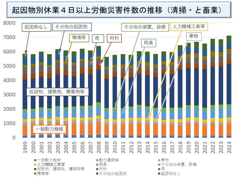清掃・と畜業についても、「仮設物、建築物、構築物等」の割合が高い。2024年の「仮設物、建築物、構築物等」を起因物とする災害 2,801 件(2,643 件)のうち通路が 1,233 件(1,116 件)、「階段、桟橋」が 597 件(575 件)となっている。ここでもほとんどが転倒災害であろう。
