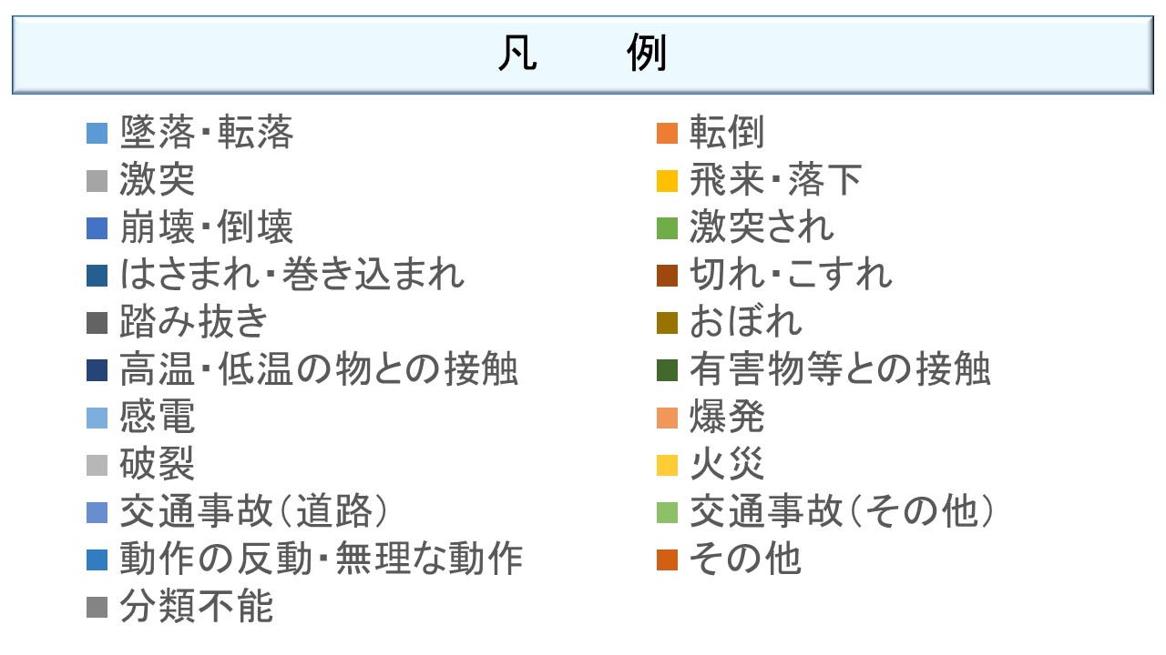 中央付近の最も大きな青い部分は「はさまれ・巻き込まれ」で、製造業では今なおこの型が最も多い。一番下の水色は「墜落・転落」その上のオレンジは転倒である。
