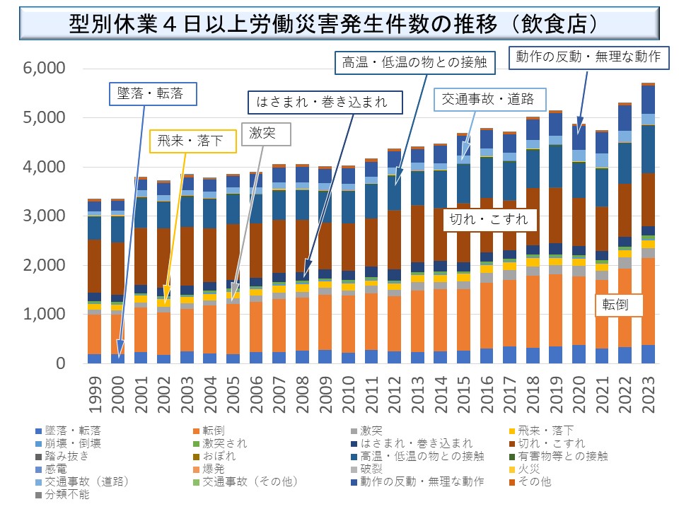 第三次産業において増加傾向が大きいの業種の一つが「飲食業」である。「飲食業」について型別災害の推移を示したものが次図である(※)が、飲食業単独でみても 1999 年以降増加傾向がみられる。