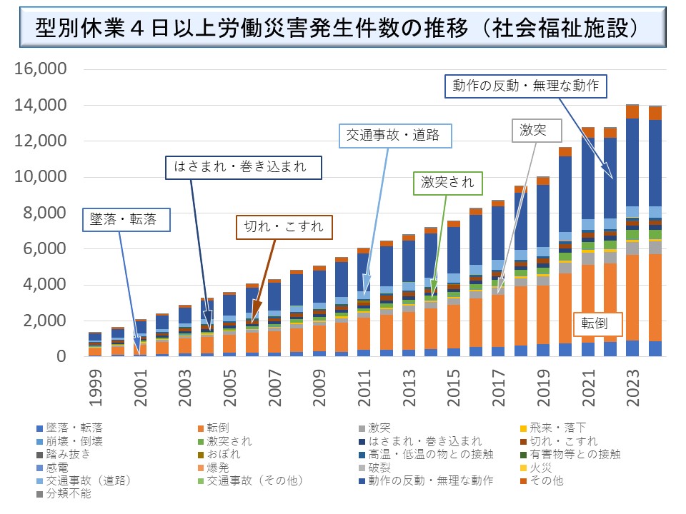 件数の絶対値としては「転倒」と「動作の反動・無理な動作」がほとんどを占める。「墜落・転落」も一定程度発生しているが、多くは階段などで足を踏み外すようなケースで、対策が取りにくいのが特徴である。