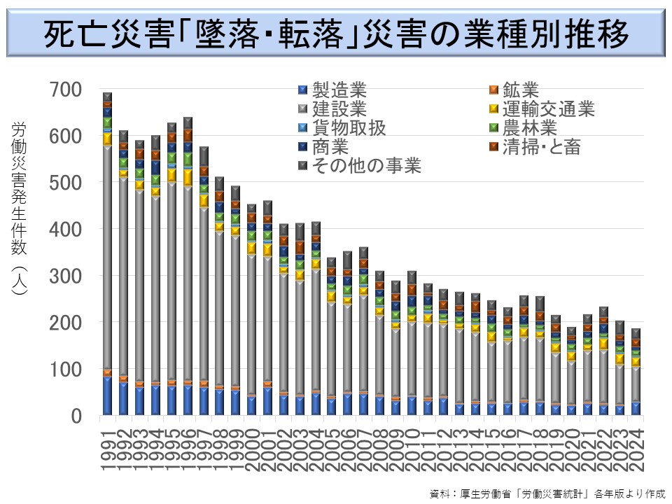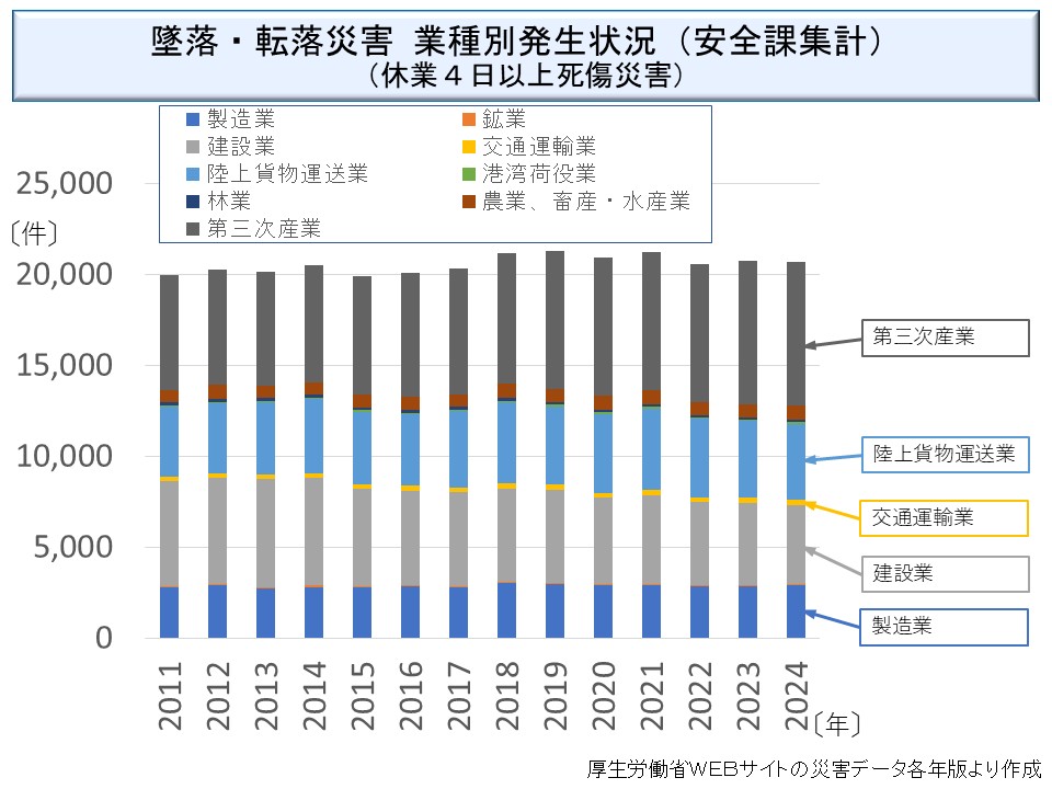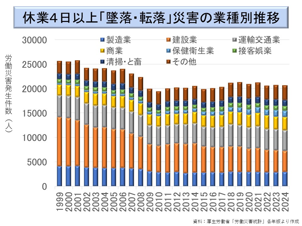 運輸交通業が一定の割合を占めているが、これはトラック等の荷台から転落して災害となるのである。対策がとり難い面があり、減少傾向はほとんどみられない。