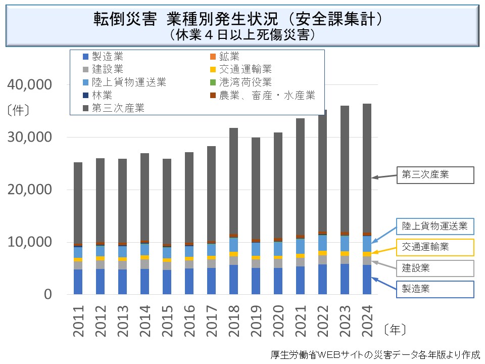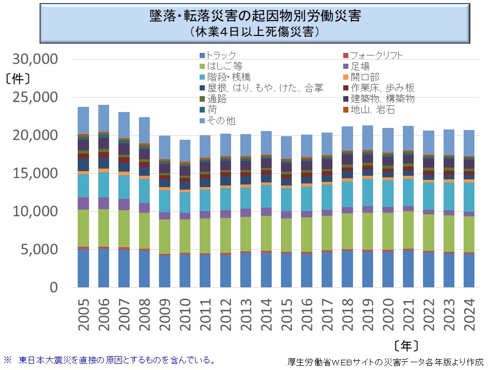 近年の労働災害防止の重点が、かつての典型的な災害であった足場や作業床からの仮設物からの墜落から、恒久的な建物内部の転倒災害などに移す必要がある(※)ことを示唆している。