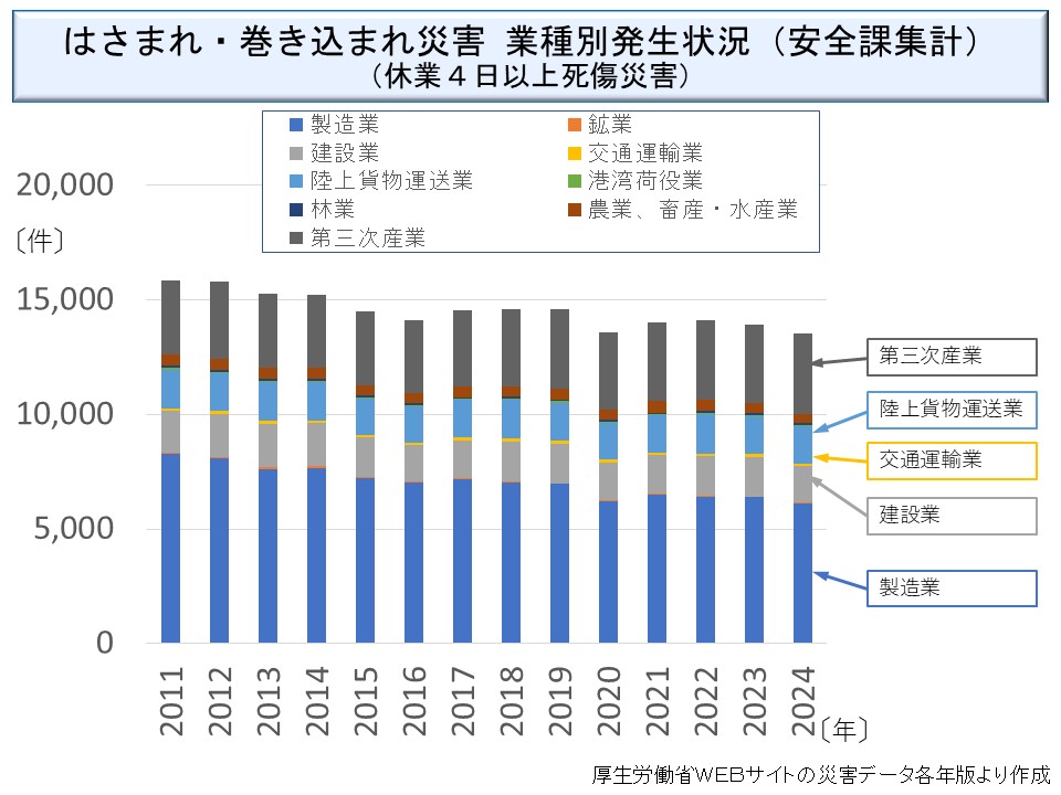 結果的に「はさまれ・巻き込まれ」死亡災害に占める製造業での発生割合はむしろ増加する傾向がある。