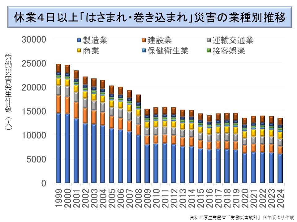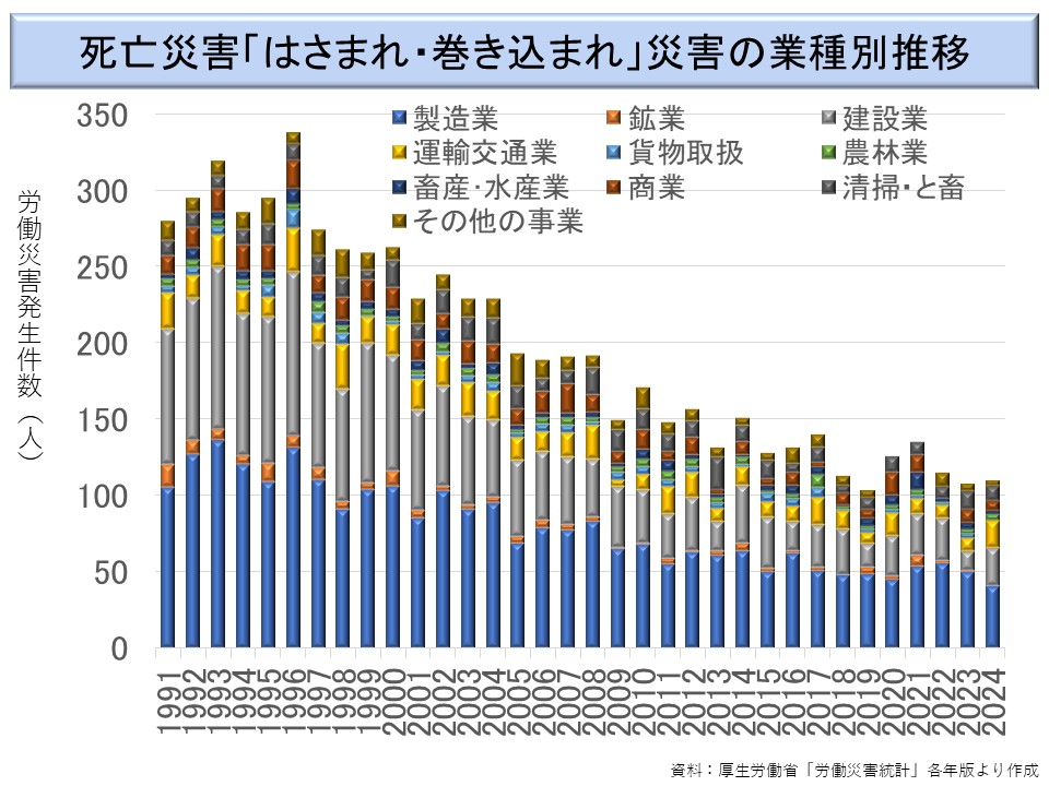 はさまれ・巻き込まれ災害は、比較的対策のとりやすい災害である。危険な場所の囲い込み、立入禁止措置、見張りの配置等によって対策がとれるため、ほぼ一貫して減少傾向がみられる。