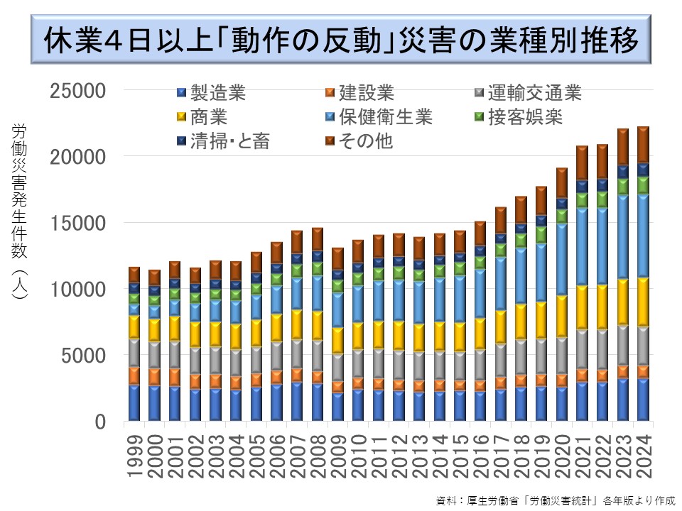 とりわけ増加の著しいのが保健衛生業である。発生件数が多いのは、病院(2024年:1,153 件)ではなく社会福祉施設(同:4,802 件)である。被介護者を移動するときなどに被災するケースが多い。