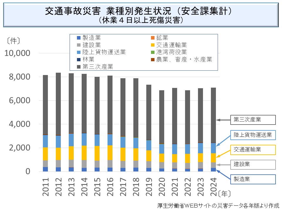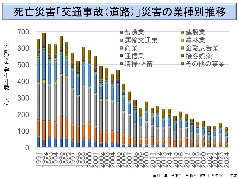 また、近年では死亡災害に占める交通労働災害の割合が高くなっている。様々な業種で発生しているが、「運輸交通業」、「商業」及び「建設業」の割合が高い。建設業は小型バスによる現場への移動が労働災害となるケースの他、道路工事で交通整理をしていて自動車にはねられるケースが多い。