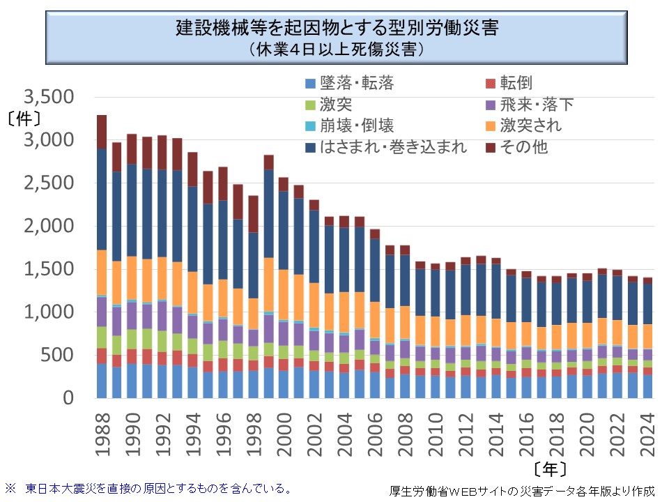 ※ 建設用機械のカウンターウエイトと壁等にはさまれた場合、本来は「激突され」となるべきだが、「はさまれ・巻き込まれ」として計上しているケースもかなりあり、「激突され」と「はさまれ・巻き込まれ」の区別は必ずしも厳密なものではない。