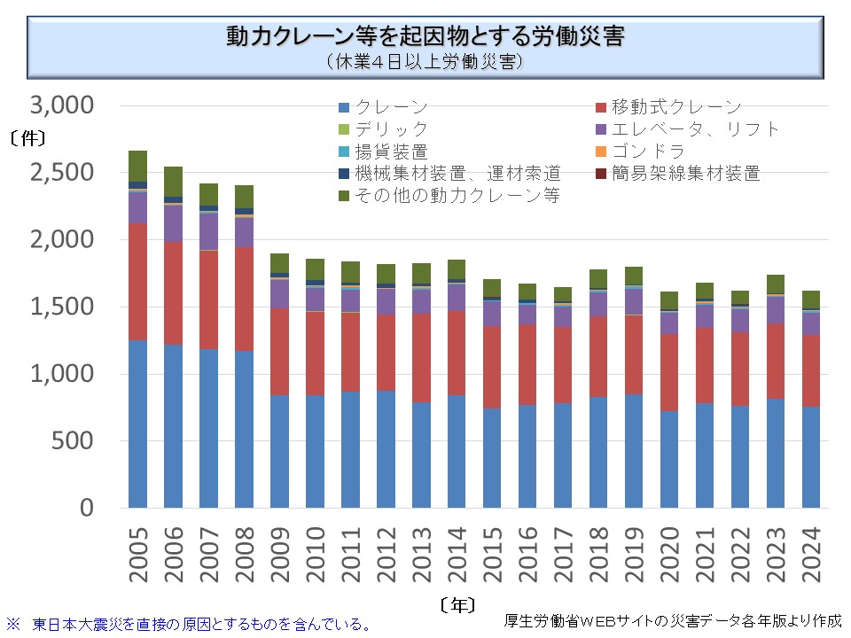 ※ 厚生労働省の災害統計では、人が通路などで転んで怪我をした場合も、建設用機械などが転倒して労働者が下敷きになったような場合も同じ「転倒」に分類している。