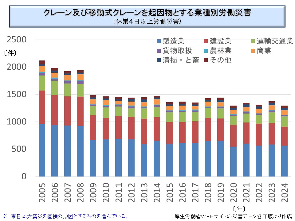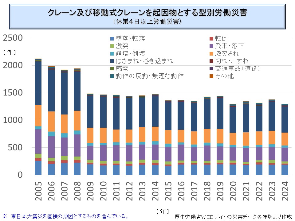 なお、ここで「挟圧」とあるのは「はさまれ・巻き込まれ」のうちの「はさまれ」と「激突され」のうち機体等と壁などの間に挟まれる形となったものの合計である。労働災害統計ではクレーン協会のみが使用している用語である。