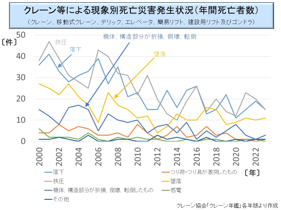 最初に、クレーン等に関して、現象別の死亡災害の発生状況をみてみよう。これについては厚生労働省の統計データに詳細なものがないので、(一社)日本クレーン協会が発行しているクレーン年鑑の数値によっている。