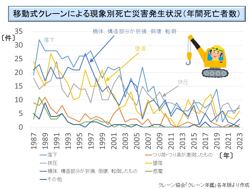 クレーン関連災害の最後に、移動式クレーンによる現象別の死亡災害の発生状況をクレーン年鑑によって示しておく。