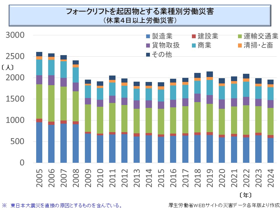 次にフォークリフトの業種ごとの発生状況を示す。様々な業種で発生しているが、製造業、運輸交通業のみならず商業でもかなり発生している。