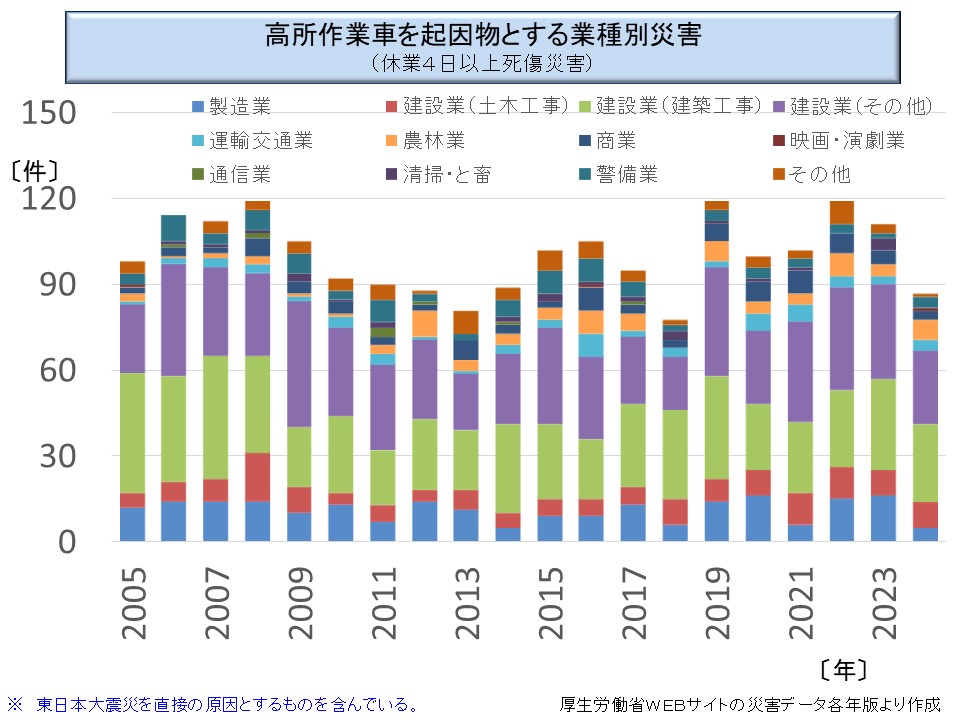 ※ 映画の撮影現場では高所作業車は「クレーン」と呼ばれ、椅子に座ったカメラマンが高所から撮影するための設備である。しかし、椅子に座ったままの作業で、狭隘な場所に近づく必要もないのでほとんど事故は起きないのだろう。