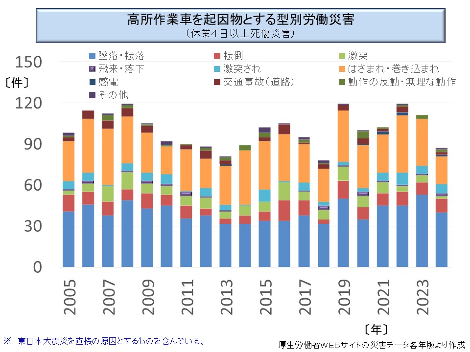 次に、高所作業車の災害発生件数を型別にみると次のようになる。墜落転落が最も多いが、バケットなど作業台から墜落するケースだけではなく、地上から高所作業車の作業台へ移動しているときに墜落するケースや、崖などから高所作業車ごと墜落するケースもある。