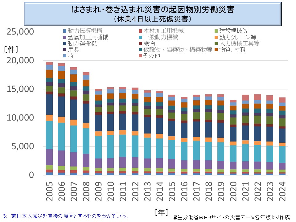 これについても起因物別の推移を見てみよう。はさまれ・巻き込まれ災害に関しても、起因物を調べることで、何に挟まれたかが判断できる。
