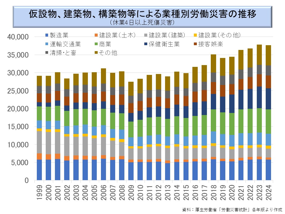 最近では、むしろ商業の方が多くなっているのである。また、保健衛生業が急増しており、最近では建設業よりも多くなっている。すなわち、仮設物、建築物、構築物等による災害であっても、近年では非工業的業種の労働災害発生件数が問題となっている(※)のである。