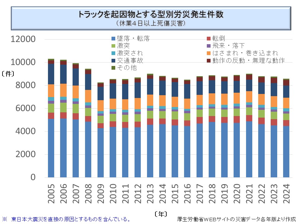 しかし、実際には「墜落・転落」が交通事故よりも多いのである。そのかなりの部分は荷台からの墜落である。トラックの荷台からの墜落災害防止が、陸上貨物運送業の重要な課題となっている。